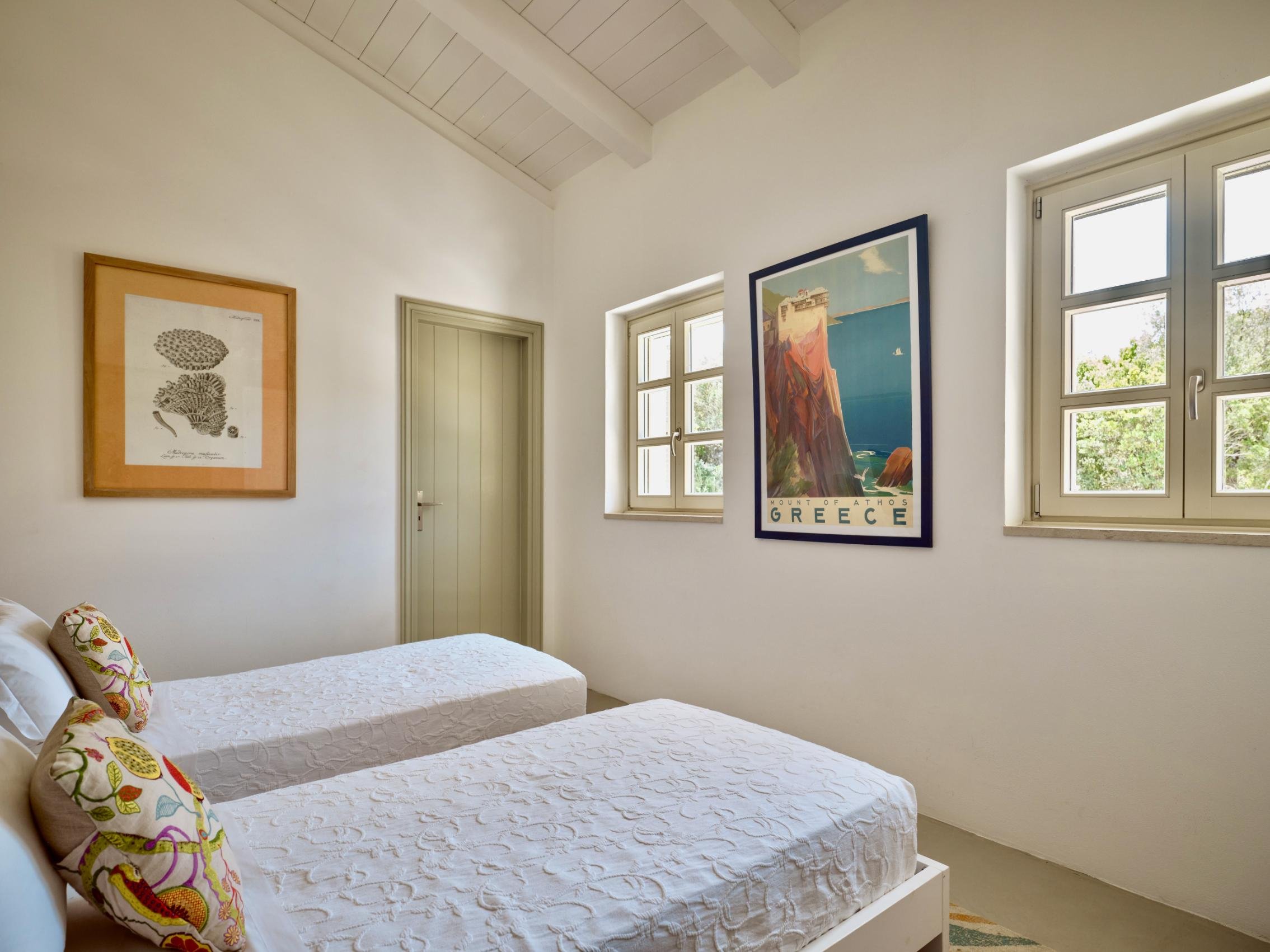 In the basement there is a separate room for fitness with a rowing machine, Swiss balls, weights, yoga mats and so forth. Upstairs the house has three more generous bedrooms. The primary suite has a broad balcony with wide-reaching views of the Ionian Sea, Kefalonia and Ithaca. All the bedrooms have air conditioning.